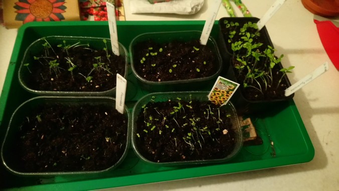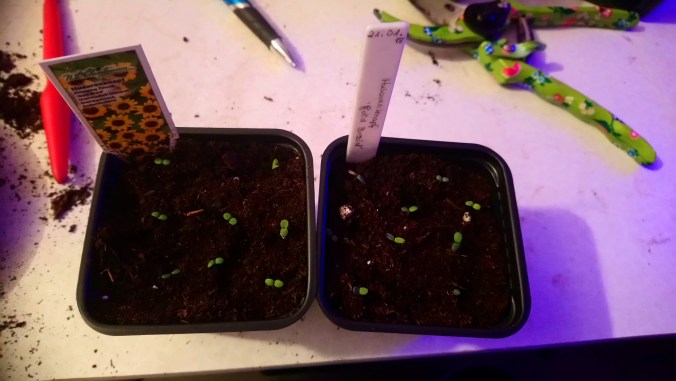 In den Aussaatschalen befinden sich, Lavendel, Zitronenmelisse, zwei Arten von Basilikum und als Experiment das Husarenknöpfchen. Bin selber gespannt, wie sich die Pflanzen weiterentwickeln.