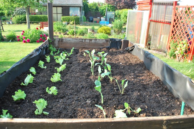 Das Hochbeet wurde mit frischer Erde aufgefüllt und das Gemüse konnte einziehen. Neben den klassischen Radieschen und Möhren zogen dieses Jahr Mangold, Aubergine , Kohlrabi, Salat und die mexikanische Minigurke ein. Bis auf die Möhren und Radieschen sind die anderen Gemüsepflanzen vorgezogen. Das Einpflanzen war schnell erledigt und das Hochbeet erscheint nachdem ordentlichen Wässern in einem schönen Bild.