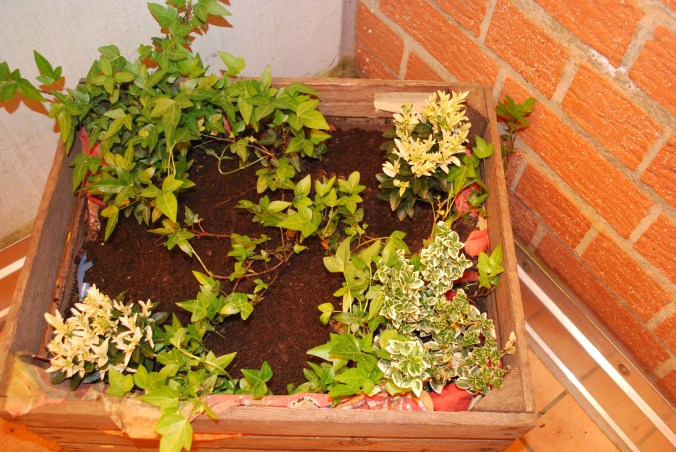 In meiner bepflanzten Obstkiste geben der Efeu und die Spindelsträucher die Grundstruktur für die zukünftigen Blütenpflanzen. Auch ohne andere Pflanzen bilden sie auf dem Balkon einen Blickfang.