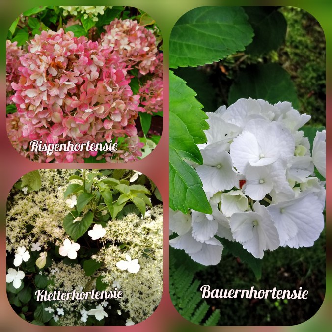 Kletterhortensie und Rispenhortensie fühlen sich im Halbschatten, sowie an einem sonnigen Standort wohl. Unsere Kletterhortensie wächst an einem sonnigen Standort und die verträgt sie sehr gut. In der Sonne kommen die Blüten der Rispenhortensie besonders zur Geltung. Ein spannendes Farbenspiel wird sichtbar. Ich mag das sehr!
