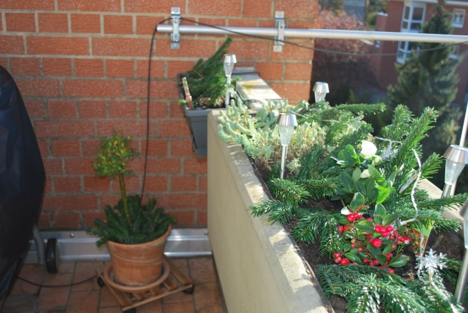 Nachdem alles so funktioniert hat, wie ich mir das überlegt habe, bin ich mit meinem winterlichen Balkon sehr glücklich. Zur Adventszeit wird dann der gesamte Balkon im Licht der Lichterkette erleuchten. Wenn dann noch Schnee liegt, ist es sicher ein besonderer Anblick.