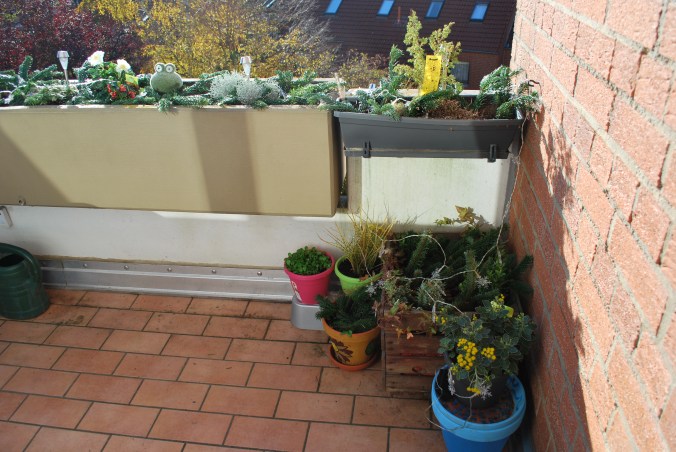 So sah der Balkon nach den ersten Arbeiten aus. Es wirkte auf einmal wieder ordenlicher und zeigte eine gewisse Struktur auf. Auf der einen Seite fand ich es gut, dass es einen ordenlichen Eindruck vermittelt, aber auf der anderen Seite fehlte mir die Blütenpracht. Diese Gedanken habe ich bereits in meinen Vorüberlegungen mit einbezogen. Also habe ich mir gedacht, fast alles mit Tanne auszuschmücken und mit einer Lichterkette zum Strahlen zu bringen. Für den großen Blumenkasten wollte ich die ein oder andere winterharte Pflanze noch einpflanzen. Der Salix in den einen Kübel bekommt einen Winterschutz, damit er im nächsten Jahr wieder sein ganzes Grün zeigen kann. Das waren meine Überlegungen im Vorraus. Also machte ich mich an den zweiten Teil.