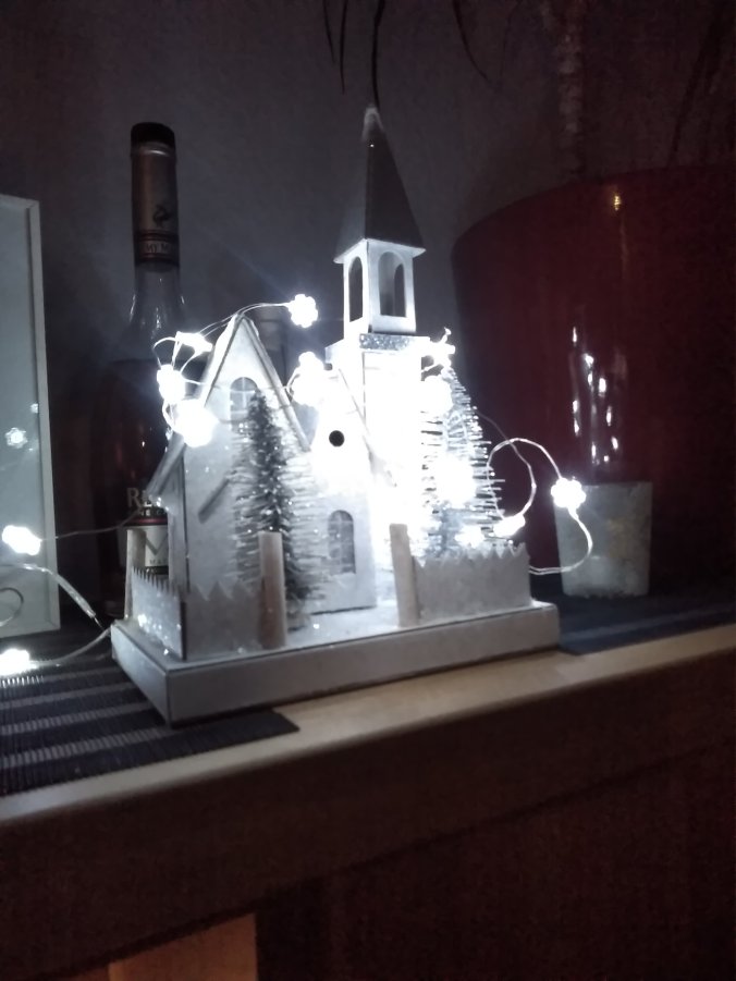 Die erste Weihnachtsdecke hat sich schnell in Position gesetzt. Dadurch das der Stubentisch schon in einer besinnliichen Stimmung gesetzt wurde, konnte der weitere Adventszauber enstehen. Das Regel über der Couch wurde zum Treffpunkt der Wichtel und Weihnachtsmänner. sie erstrahlen besonders, wenn sie im Lichte der Lichterkette stehen. Außerdem bereichert, eine winterliche Kirche mit Lichtelement eine romantische Atmosphäre. Mit wenigen Handgriffen entstand eine schlichte, aber wirkungsvolle Dekoration.