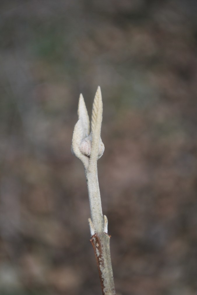 Bei diesem Bild zeigt sich eine andere Form der Knospe. Sie ist länglich und der Mitte befindet sich eine Art zweite, runde Knospe. Es ist zwar keine Knospe, sondern eine Art Blütenansatz für eine winterliche Blüte. Auch hier lässt sich schön das Zusammenspiel zwischen Knospe und Gehölz darstellen.