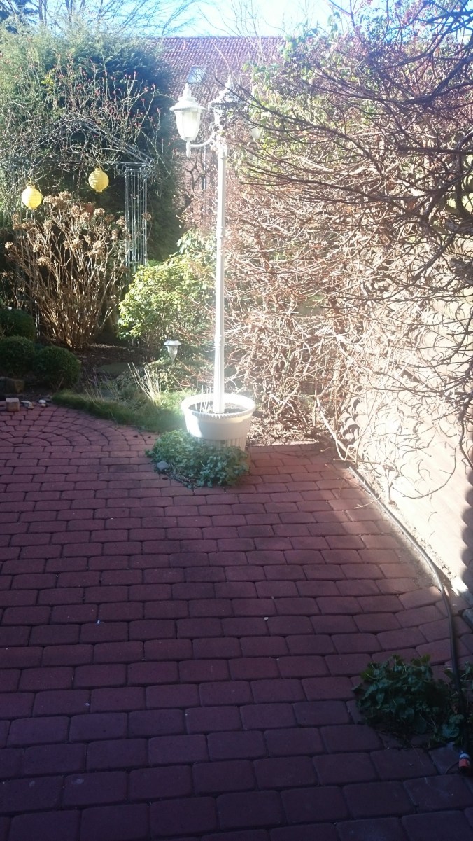 Man sieht schön, dass eine direkt klare Strukturen vorhanden sind und die Wintersonne alles hell erleuchten lässt. Dadurch das so klare Strukturen vorhanden sind, muss nur mein beziehungsweise unser persönlicher Geschmack entstehen. Natürlich ist klar, dass die Terrasse kinderfreundlich gehalten wird. Dieser Aspekt wird erst im Laufe der nächsten Jahre mein Hauptaugenmerk sein (Mein Sohn ist erst 3 Wochen alt.) . Besonders schön ist auch noch, dass wir von der Hauptstraße gut abgegrenzt sind. Ein kleines Paradies mitten der Stadt. Dadurch haben wir als Familie eine optimale Privatsphäre, ohne das man sich beobachtet fühlt.