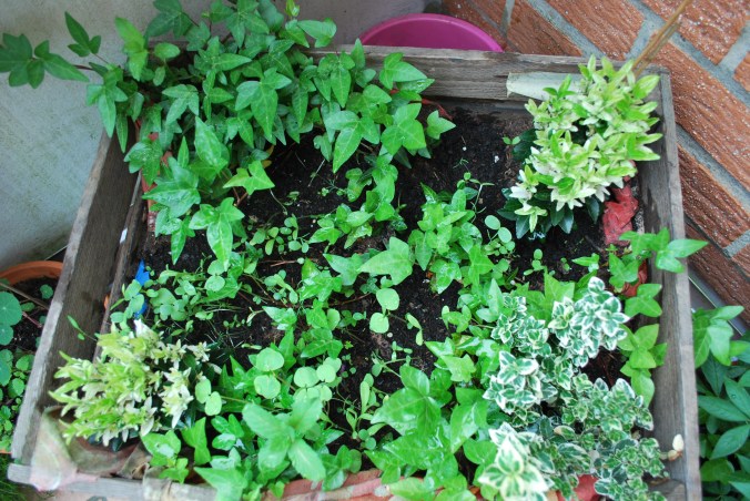 Efeu findet man überall, in Parks, Wälder und in fast jeden Garten. Manche finden ihn total nervig, aber er ist ein Multitalent. Durch sein saftiges, schönes grün bildet er mit blühenden Stauden, einjährigen Sommerblumen oder sogar anderen Blattschmuckpflanzen einen atemberaubenden Kontrast. Ich habe den Efeu als Leitpflanze in meiner bepflanzten Obstkiste eingesetzt und dadurch die Gestaltung aufgebaut. Der Efeu soll zusammen mit der Kiste eine Einheit bilden.