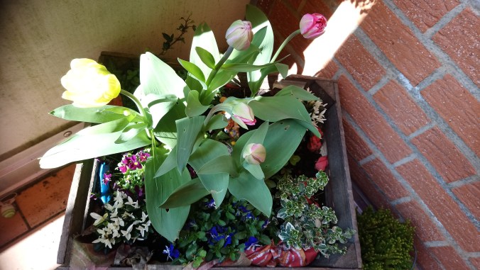 Sogar Blumenzwiebeln kann man wunderbar in eine Kiste setzen. Es sollte nur beachtet werden, dass eine niedrige Sorte ist.