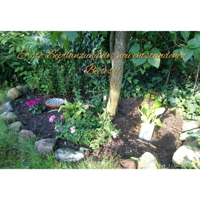 Tja…die Bepflanzung war jedesmal ein Experiment!! Ich war mir gar nicht so sicher, welche Stauden oder einjährige Pflanzen den Weg ins Beet finden sollten. Nach langer Überlegung wurde es eine Mischung aus Verbenen und schattenliebenden Stauden. Meine selbstgestaltete Vogeltränke bekam auch noch einen schönen Platz. Für die erste Bepflanzung fand ich es total gut.