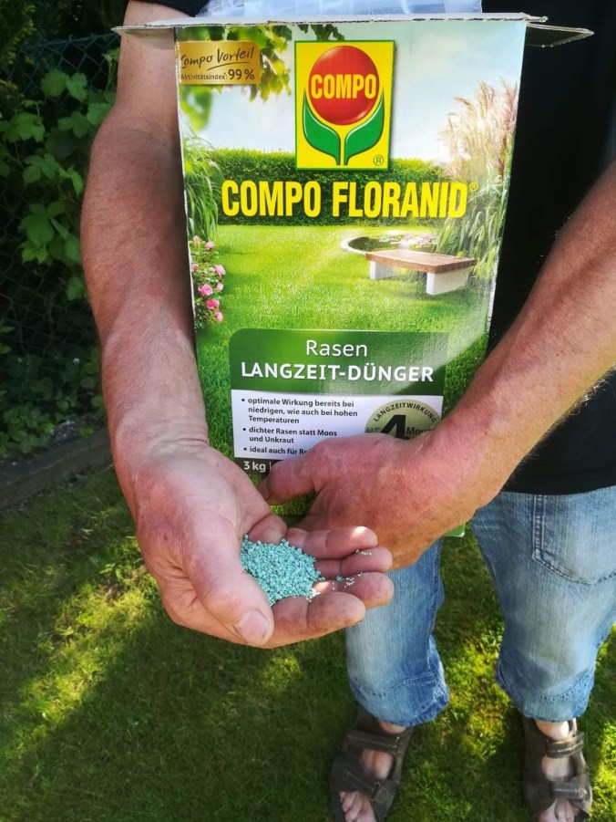 Wichtig ist, dass der Dünger speziell für den Rasen ist. Den die Zusammensetzung des Düngers ist speziell für die Ansprüche einer Rasenfläche zusammen gemischt. Neben den Hauptnährstoffen Stickstoff, Phosphor, Kalium und Magnesium befinden sich auch Spurenelemente wie Eisen, Zink oder Mangan im Dünger. Vor allem der Stickstoff bildet den zentralen Nährstoff. Stickstoff ist für die Bildung der Grünmasse zuständig. Alle anderen Nährstoffe stehen im richtigen Verhältnis zum Stickstoff. Diese optimale Zusammensetzung hat der Rasendünger von Compo. Der Rasendünger von Compo ist ein Langzeitdünger, der in Form eines Granulats ist. Dabei werden die Nährstoffe nach und nach freigesetzt. Das bedeutet, dass die Düngung über einen längeren Zeitraum gewährleistet ist. Eine gleichmäßige Ausbringung muss gut gelingen, damit jeder Rasenabschnitt optimal versorgt wird. Wir haben den Dünger mit Hilfe eines Streuwagens auf unsere Rasenfläche ausgebracht. Dadurch könnten wir sicher gehen das sich der Compo- Rasendünger gleichmäßig auf der Fläche verteilt und sofort die Nährstoffe ihre Arbeit aufnehmen.