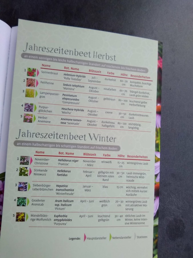 Gleich beim Aufklappen des Buches bekommt man eine jahreszeitliche Übersicht für das Frühjahr und Sommer. Im hinteren Teil des Buches gibt es die gleiche Übersicht für den Herbst und Winter. Beim weiteren Aufklappen bekommt man eine erste Übersicht von Stauden, die einfach alles können. Die ersten Übersichten sind von den Autoren sehr sorgfältig ausgearbeitet.