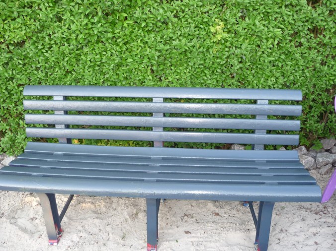 Natürlich gibt es zwei, weiße Bänke aus Plastik. Insgesamt waren es Drei, aber eine hat die Funktion der Blumenbank übernommen (siehe Beitrag zur Blumenbank). Ich finde Weiß so ziemlich langweilig. Ein bisschen Farbe hat noch niemand geschadet. Also habe ich mir die Aufgabe der farblichen Gestaltung der Bänke vorgenommen. Die eine Bank ist in Anthrazit und die andere Bank ist in Lila gestrichen. Ein guter Auftakt für das VIVA Mallorca im Garten!