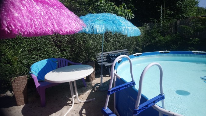 Rund um den Pool fehlte trotzdem noch die Gemütlichkeit. Ein Strand im Garten wäre mal was anderes! Gesagt, getan! Weitere Rasenfläche wurde abgetragen, damit der „Strand“ einen größeren Radius bekommt. In Eile und mit viel Spaß wurde der Spielsand organisiert und verteilt. Für den Anfang nicht schlecht. Aus Zauberhand sind dann noch Hawaii-Schirme auf getrieben wurden. Aber wo kann man sitzen??