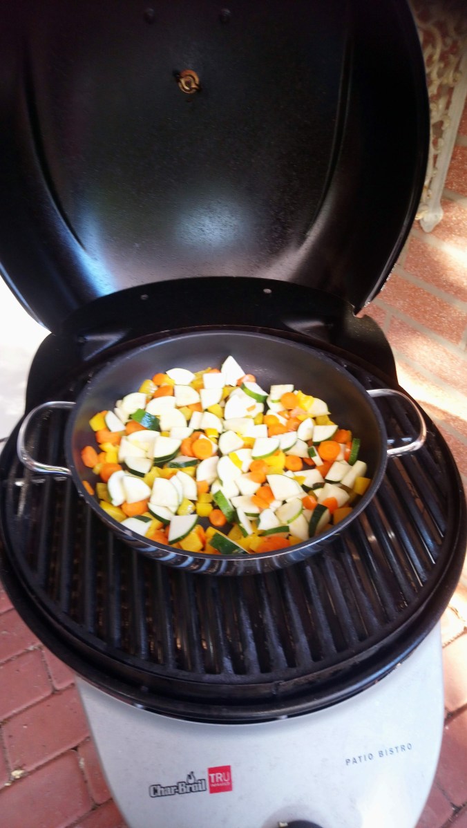 Aber nicht nur das Genießen steht auf dem Plan, auch das Kochen auf der Terrasse. Bis jetzt haben wir bei fast jeder Gelegenheit gegrillt, aber nur grillen mit dem Elektrogrill finde ich irgendwie auch langweilig. Also habe ich mir überlegt, wie man den Grill noch anderes einsetzen kann. Nach etwas Bedenkzeit kam die erste Idee. Warum nicht ein Pfannengericht auf dem Grill zubereiten. Wichtig dabei war mir, dass die Pfanne hitzebeständig sein musste. Der Grill kann eine Temperatur von bis 300°C erreichen. Nachdem ich alles abgeklärt hatte mit meinem Freund, ging es los. Als Erstes wurde der Grill vorgeheizt und in der Küche habe ich Mett und Reis vorbereitet. Das Gemüse, natürlich mit der ersten, geernteten Tomate wurde auf der Terrasse verarbeitet und direkt in die Pfanne gegeben. Effektives Kochen ohne großen Aufwand! Der Deckel des Grills wurde nach jedem zu tun von dem Gemüse wieder verschlossen, so konnte die Wärme nicht groß entweichen.