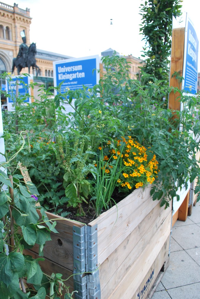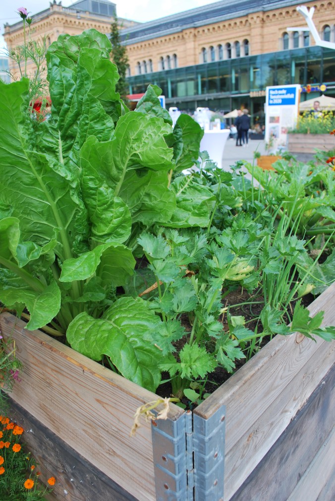 Vor dem Hauptbahnhof Hannover wurde für kurze Zeit einige Hochbeete mit unterschiedlichen Pflanzen und Kräuter aufgebaut. Zwischen den Hochbeeten konnte man sich auf die Palettenmöbel setzen und entspannen und genießen. Der Vorplatz vor dem Hauptbahnhof ist ein super Standort, denn viele Passanten gehen dort lang, um an ihr Ziel zu kommen. Durch den Stadtgarten kommen viele Menschen zusammen, um die Pflanzen und Kräuter zu bewundern und sich über das gemeinsame Gärtnern zu informieren.