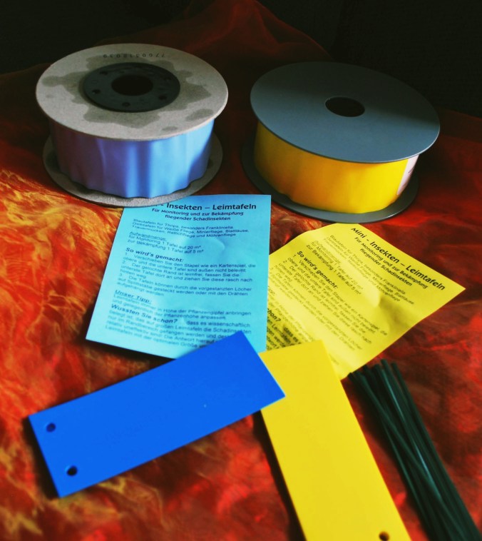 Die Gelb-und Blautafeln sind mit Leim bestrichen, wodurch die fliegenden Schaderreger an den Tafeln dann kleben bleiben. Daher die Gelb-und Blautafeln an dem gelochten Rand vorsichtig festhalten. Mit Hilfe von Draht werden sie in Höhe des Pflanzengifpfels befestigt.