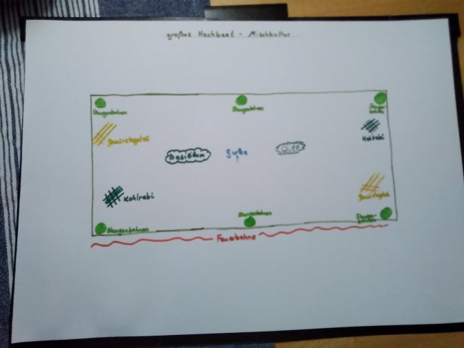 Für die nächste Gartensaison möchten wir die Mischkultur anwenden. In dem Buch von Schwester Christa Weinrich OSB “ Mischkultur im Hobbygarten“ (unbezahlte Werbung Ulmer Verlag, eine persönliche Buchrezension) wird gut erklärt, wie die Mischkultur anzuwenden ist und daraus habe ich einen Anbau-Plan für das kommende Jahr entwickelt.