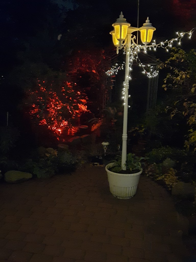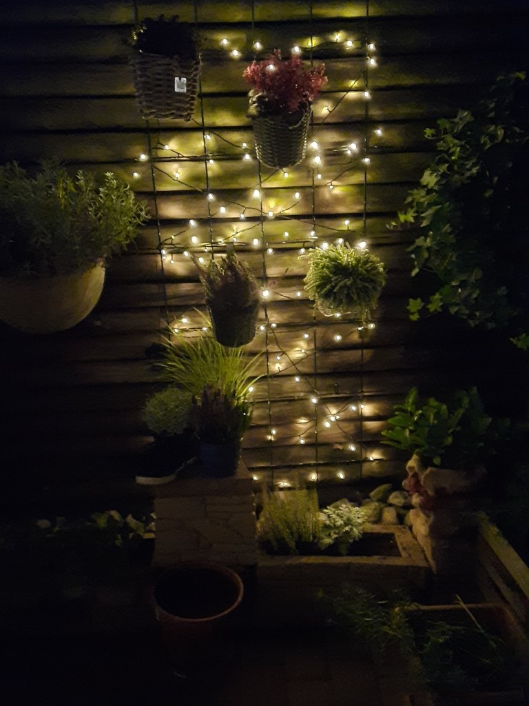 Alles zusammen wird mit Lichterketten am Abend erleuchtet (die Solarleuchten haben nicht mehr genug Sonnenlicht, um intensiv zu leuchten). Hinzu kommen jetzt noch weihnachtliche Dekorationen.