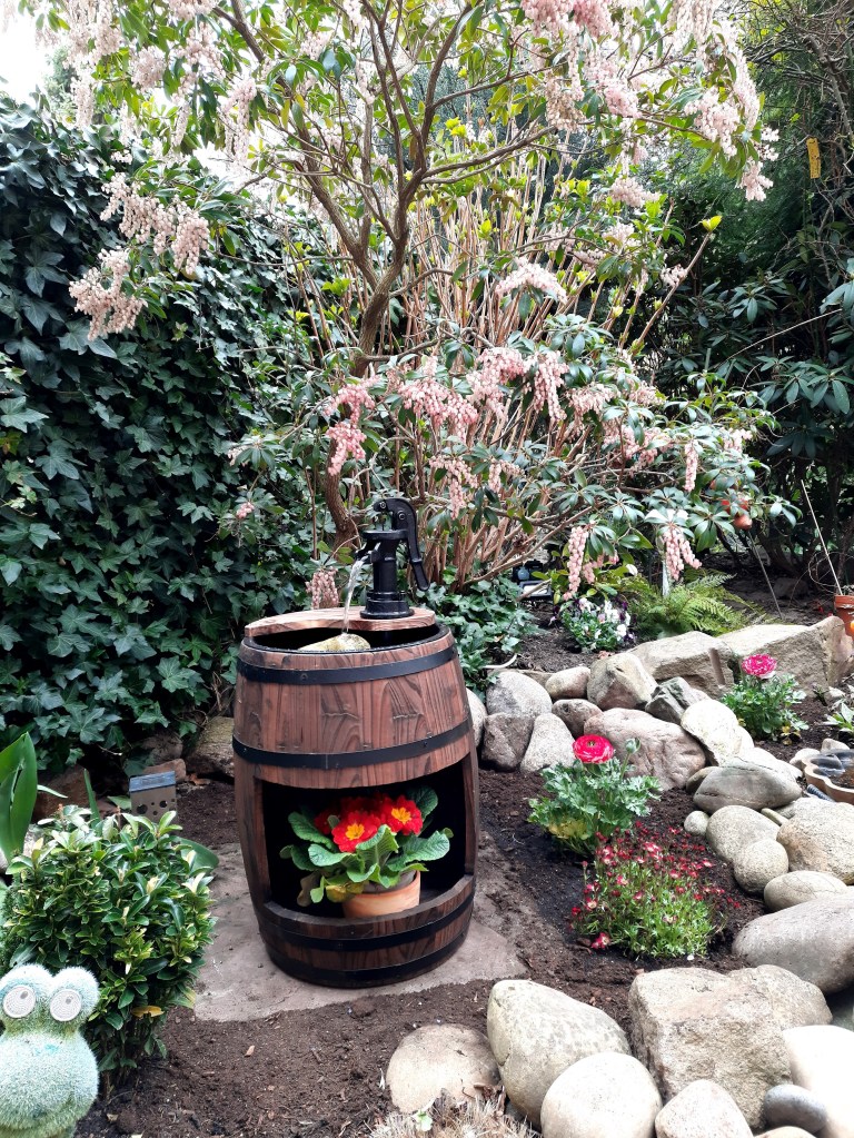 Nach langem Überlegen und einen Plan ging es los. Mein Favorit war eine Silberkugel, wo langsam das Wasser raussprudelt. Es wirkte elegant. Aber plötzlich sind wir auf ein Holzfass mit Pumphahn und Platz für Pflanzen gestoßen. Das war es! Erstens passt es zur Terrasse und das Rustikale ist mir absolut am Liebsten.