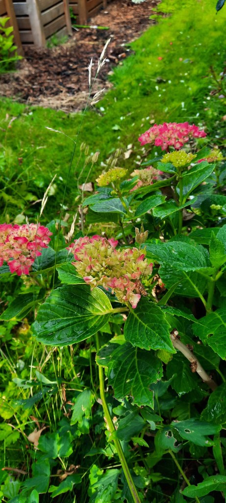 Die Bauernhortensien zeigen eine kräftige Blüte im Garten.