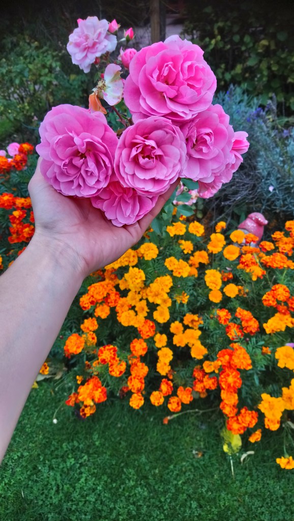 Zwischen den Rosen wächst der klassische Lavendel als Begleitpflanzen. Ansonsten ist es ziemlich abwechslungsreich, in Bezug auf verschiedene Blumen. Besonders die Tagetes, in dem einem Gartenjahr hat eine besonders Flair erzeugt (siehe unteres Bild) und war gleichzeitig eine Hommage an meine Oma! (https://sandrasgartenwelt.blog/2020/10/25/tagetes-magie-im-beet/)