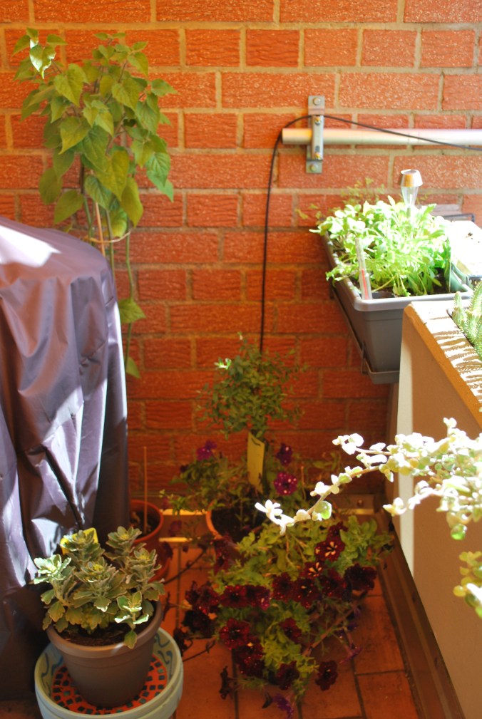 Die Obstkiste wurde von unnötigen Pflanzen befreit und sieht jetzt frischer aus. Durch die unterschiedlichen Töpfe würde eine klare Struktur gewonnen. So ist das in der anderen Seite des Balkons auch erreicht wurden. Aber nicht nur die beiden Seiten habe eine neue Struktur bekommen, auch die drei Balkonkästen wirken strukturierter und lockerer.