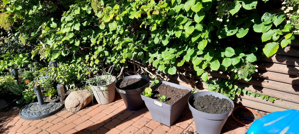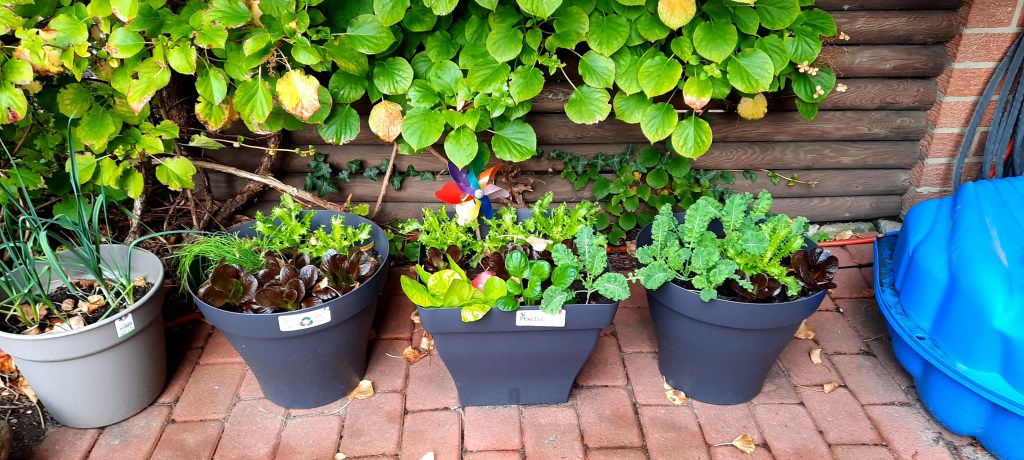 Ich hatte Jungpflanzen vom Salat gepflanzt, aber leider haben die Nacktschnecken sich daran erfreut. Daher gibt es einige Lücken in den Gemüsekübeln. Die werden demnächst wieder geschlossen mit Radieschen, Erbsen und Buschbohne, so mein Plan.