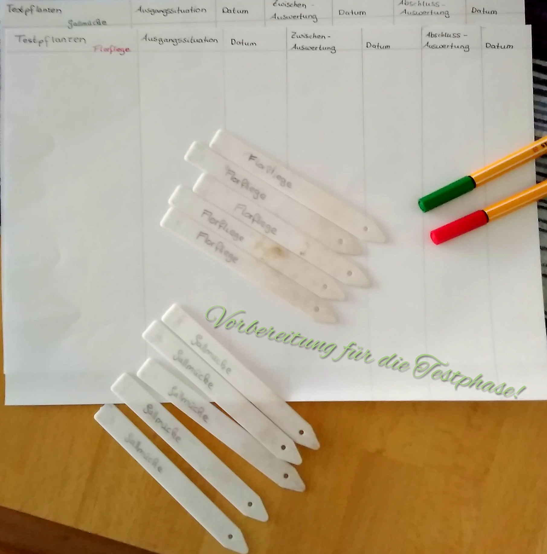Nachdem die Tabelle angefertigt war, wurden einfache Pflanzschilder mit dem jeweiligen Nützling beschriftet. Die Schilder habe ich dann in den Testpflanzen gesteckt. So weiß ich, welcher Nützling die Pflanze bekommen hat. Es wäre nämlich nicht gut, wenn alles durcheinander geräten würde.