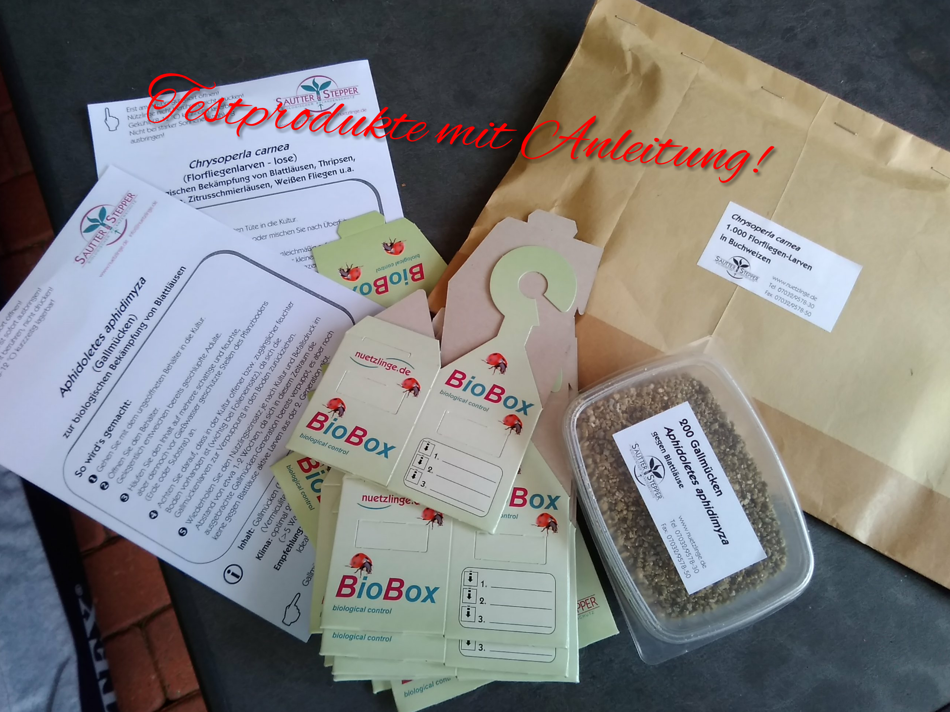 Bevor ein Testlauf erfolgen kann, stehe ich mit der Firma Sautter und Stepper in Kontakt. Über E-Mail wird besprochen, welchen Schwerpunkt der Test hat. Meistens gucke ich im Garten oder auf der Terrasse, ob ein Schädling da ist, der mit Nützlingen bekämpft werden kann. Oder es handelt sich, um eine vorbeugende Maßnahmen (siehe Blog-Beitrag: Monitoring zum Befall des Buchsbaumzünsler). Im aktuellen Testlauf geht es, um die Bekämpfung von Blattläusen (siehe Blog-Beitrag: Blattläuse entdecken meine Terrasse). Ich werde zwei Nützlinge ausprobieren und vergleichen. Der erste Nützling ist die Florfliege. Mit diesem Nützling habe ich schon positive Erfahrungen gesammelt. Im Vergleich steht dazu die Gallmücke. Für mich persönlich ein eher unbekannter Nützling. Bin schon ziemlich gespannt auf das Ergebnis.