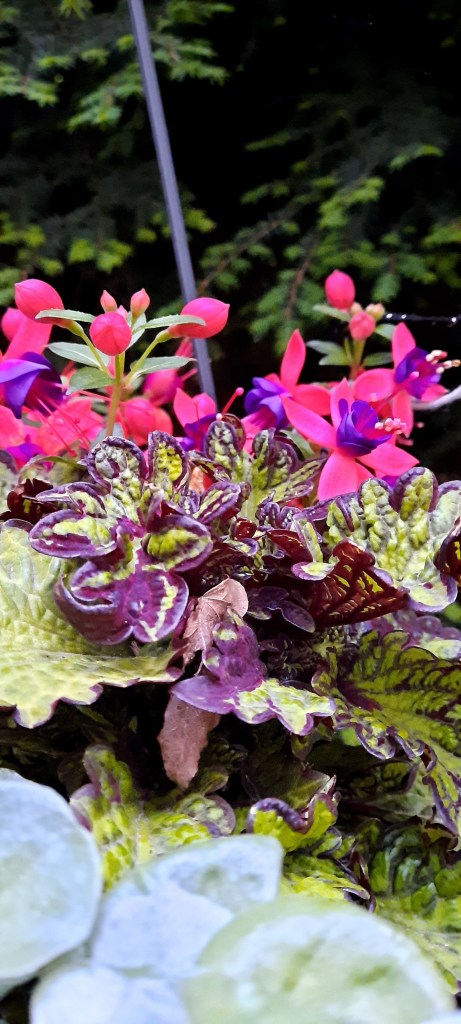 Ich habe in einer Ampel eine Fuchsie mit rot, lila Blüten zusammen mit einer Art Silberregen und einer Buntnessel mit grünen, lila Blätter gepflanzt. Dadurch spiegelt sich das Lila der Fuchsie in der Buntnessel wieder. Es wirkt alles aufeinander abgestimmt. Keiner der Pflanzen wird verdrängt, sondern sie spielen miteinander und das ist sehr wichtig, wenn die Buntnessel als Blattschmuckpflanze eingesetzt wird.