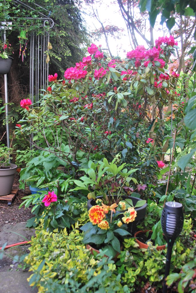 Die blumigen Gesellen auf der Terrasse sind traumhaft. Die Kletterrose und die Bodendeckerrose wachsen gut und haben kräftige Knospenansätze. Es wird wahrscheinlich nicht mehr lange dauern, bis sich ihre Knospen öffnen. Ich freue mich riesig auf ihre Blüte. Rosen gehören zu meinen absoluten Lieblingen, schon seit Kindertagen. Der pinke Rhododendron blüht hübsch und stark im Farbausdruck. Er passt an der Stelle hervorragend und das wird auch so bleiben.