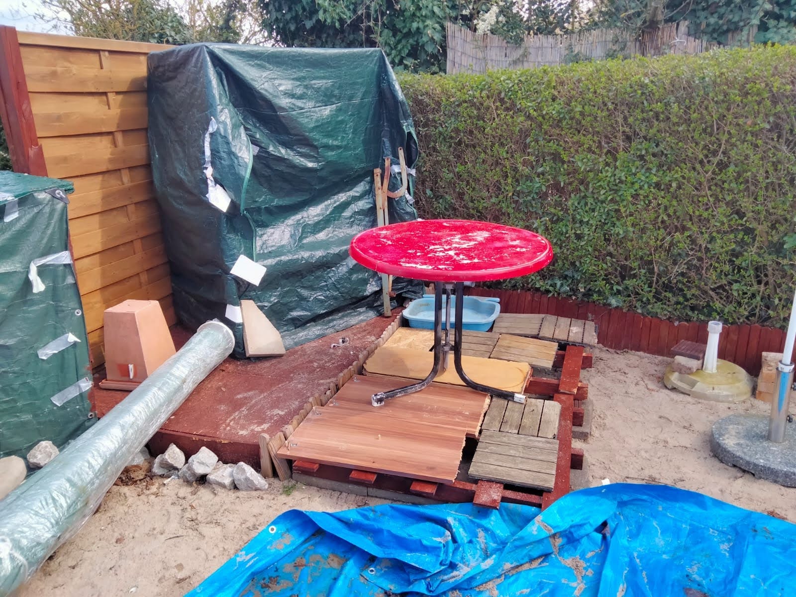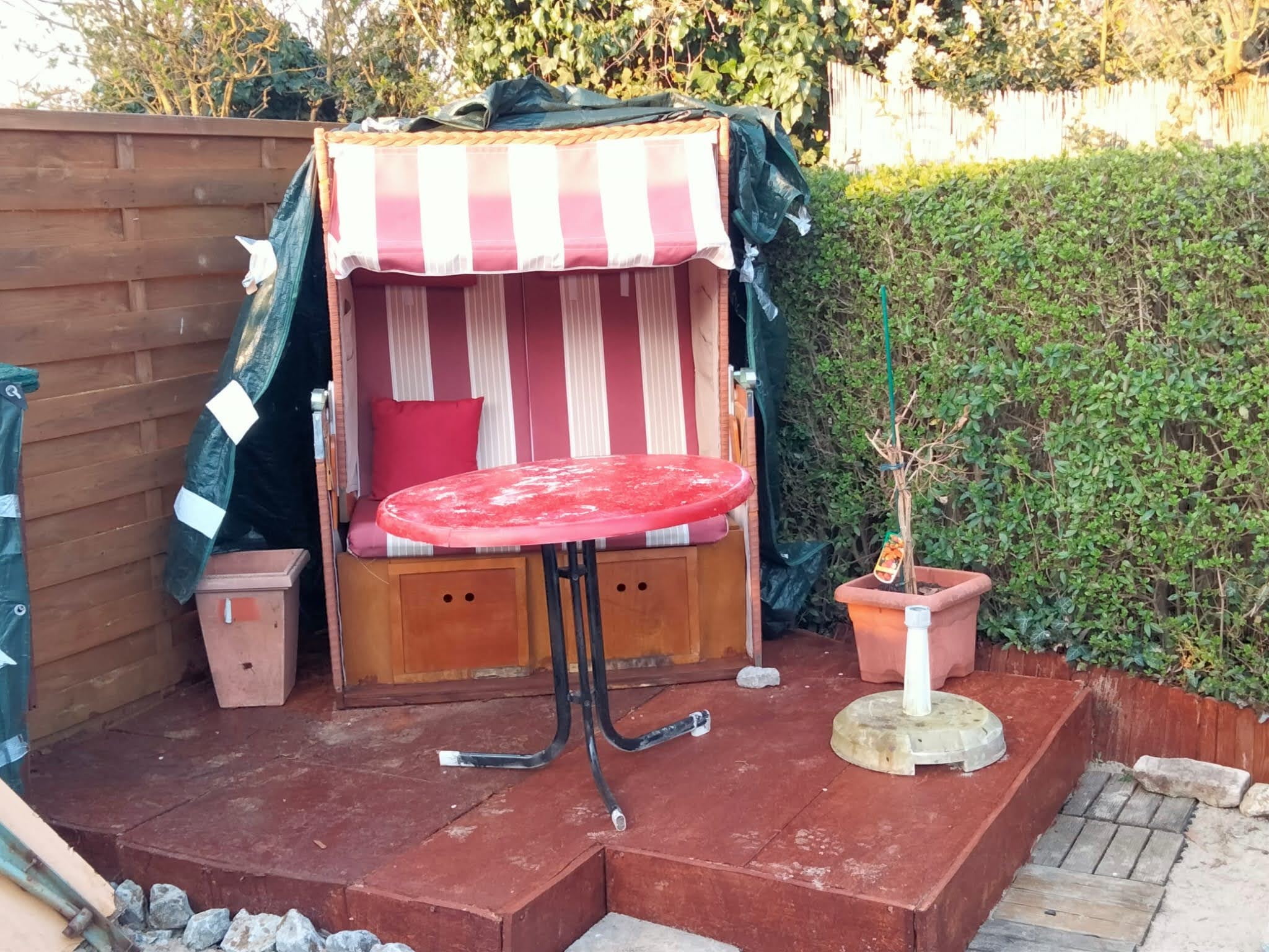 Bereits in der letzten Gartensaison ist eine kleine Terrasse entstanden, wo der Strandkorb einen neuen Platz bekommen hat. Denn der Strandkorb stand vorher direkt auf der Sandfläche und auf Dauer ist das nicht gut. Daher haben wir uns entschieden eine kleine Terrasse zu bauen, wo er drauf stehen kann.