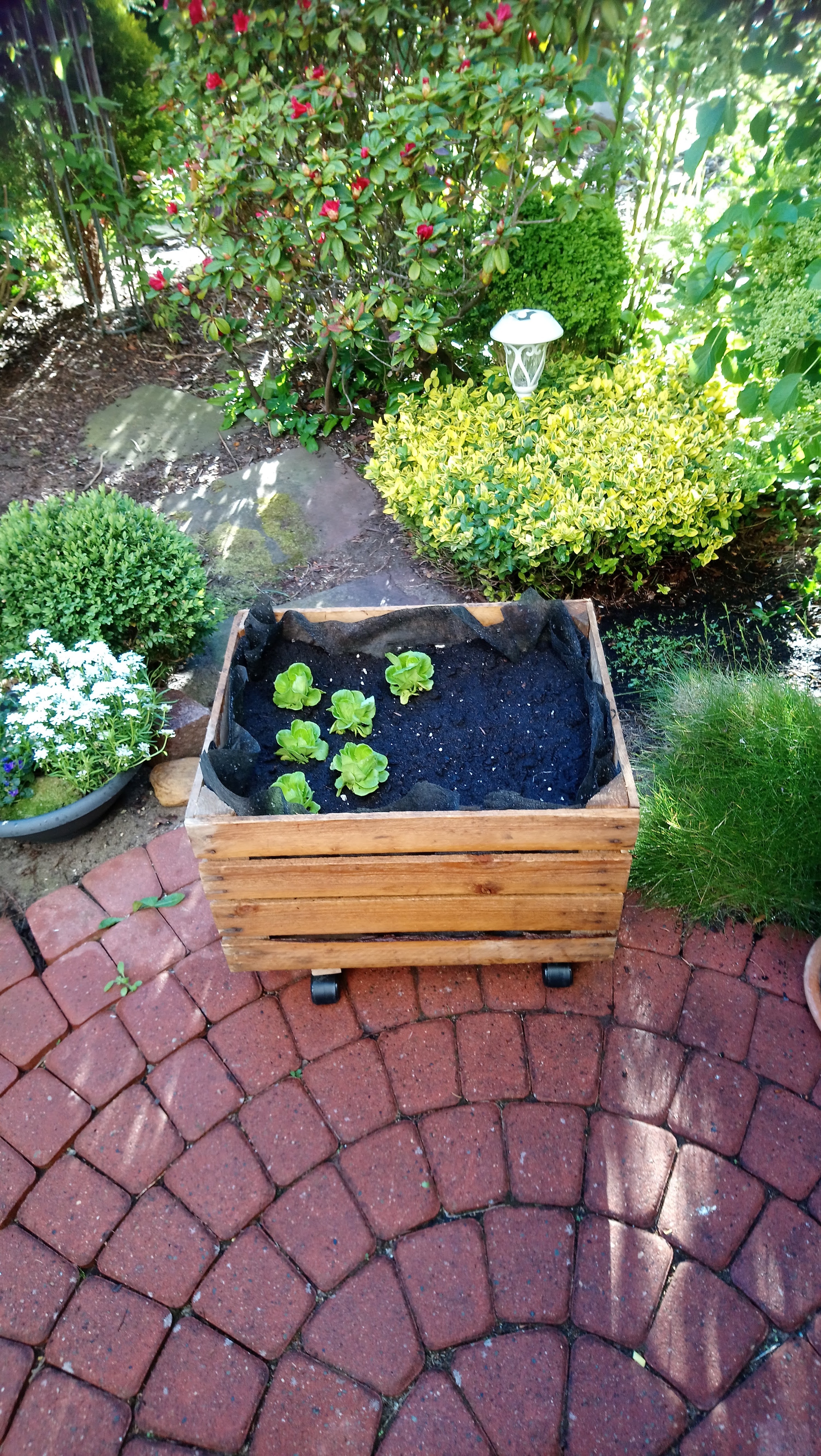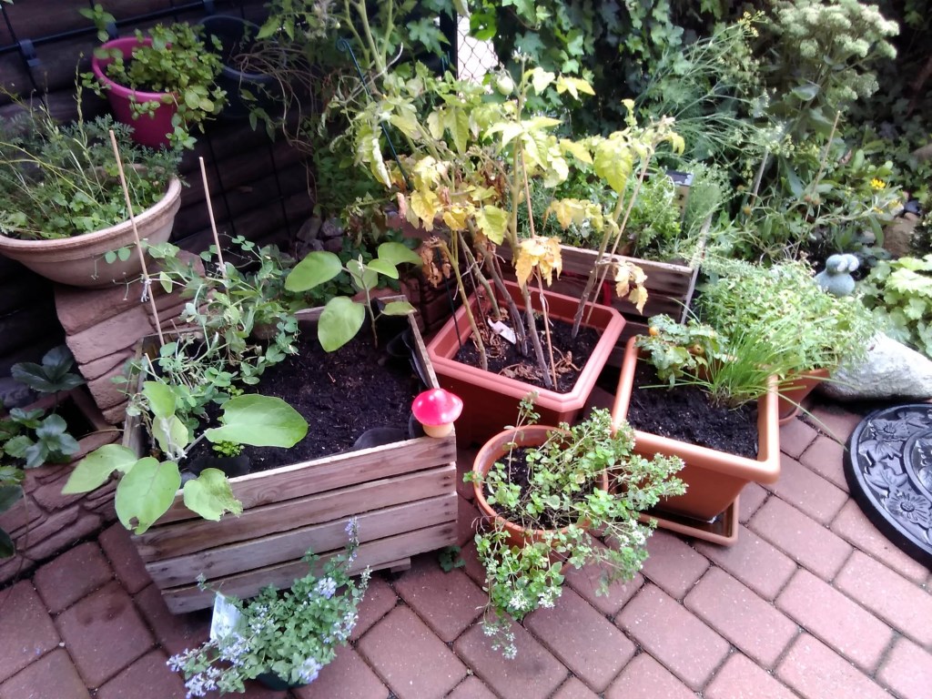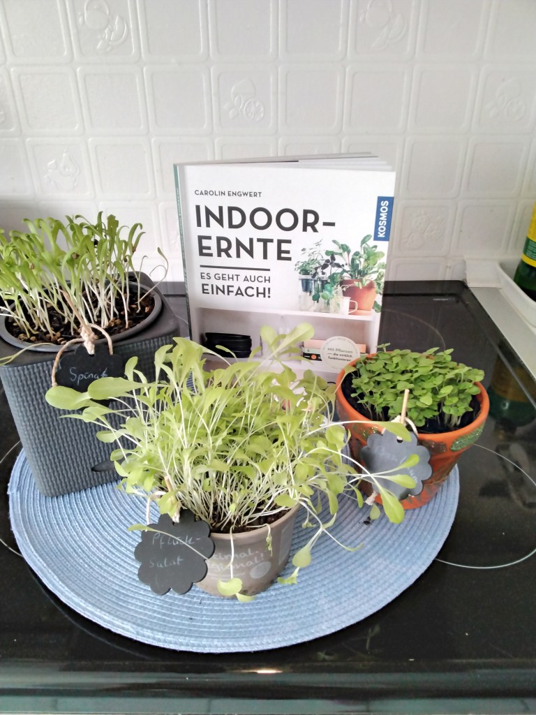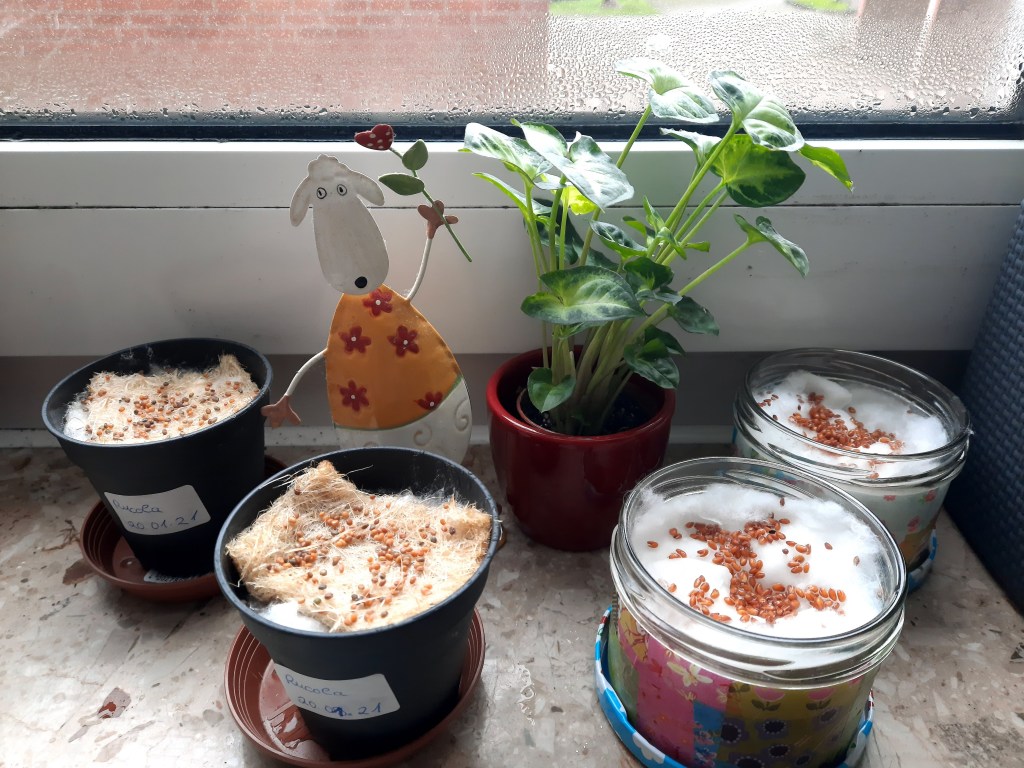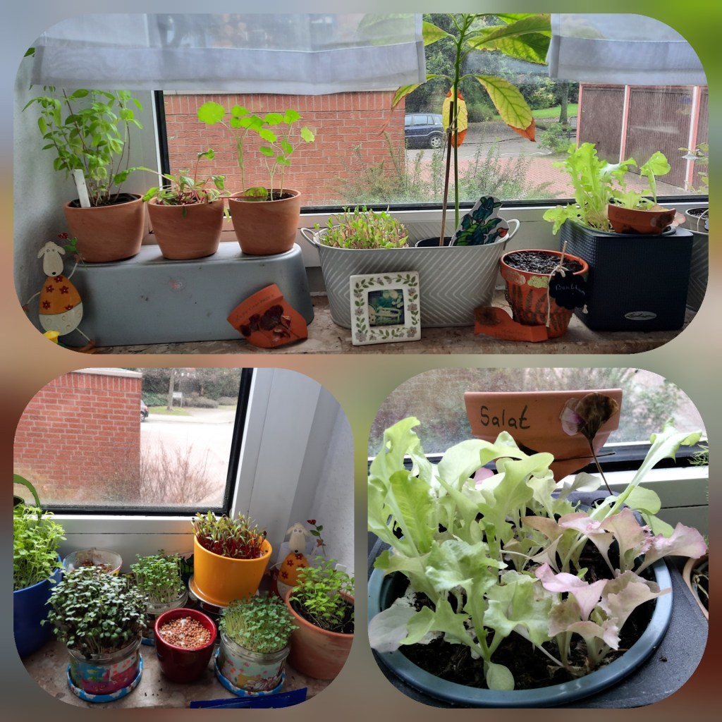 In Zwei der vier Gemüsekübel treiben gerade Tulpen aus. Ich weiß, dass es ein wenig zu früh ist, aber ich habe in den einen Gemüse- Kübel schon vorgezogenen Salat gepflanzt. Er wächst gut und ich freue mich auf die erste Ernte. Hoffentlich bleibt das so. Manchmal muss man etwas riskieren, um neue gärtnerische Erfahrungen zu machen.
