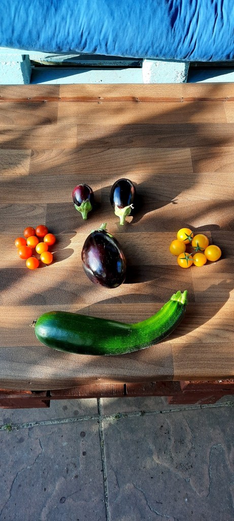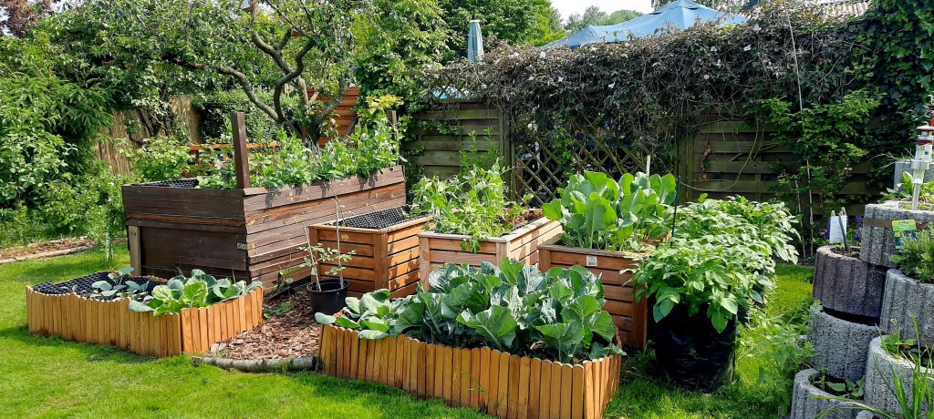 In den anderen Hochbeeten wachsen Minze, Möhren, Zucchini,Gurke, Rote Beete und Blumenkohl. Es wächst vor sich hin, mit einem besonderen Charakter. Man sieht, dass die Witterungsverhältnisse den Gemüsepflanzen ganz intensiv zu schaffen macht. Die Nacktschnecken erfreuen sich daran. Daher wird unsere diesjährige Gemüseernte wohl gering ausfallen.