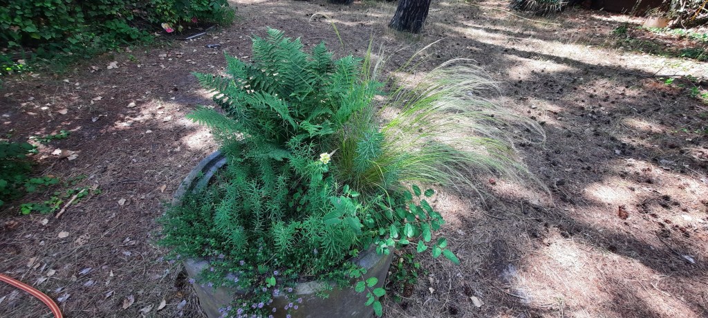 Nachdem die Grundstruktur vorhanden war, kamen die Upcycling-Gefäße (mehr zum Thema Upcycling hier klicken: https://sandrasgartenwelt.blog/2021/08/23/upreycling-macht-spass/) ins Spiel. Alle Upcycling-Gefäße hab ich ausschließlich mit meinen Pflanzenlieblingen bepflanzt oder einfach die ursprüngliche Bepflanzung beibehalten. Auf den unteren Bilder bekommt ihr einen Einblick auf meine ganz persönliche Upcycling-Ecke im Waldgarten.